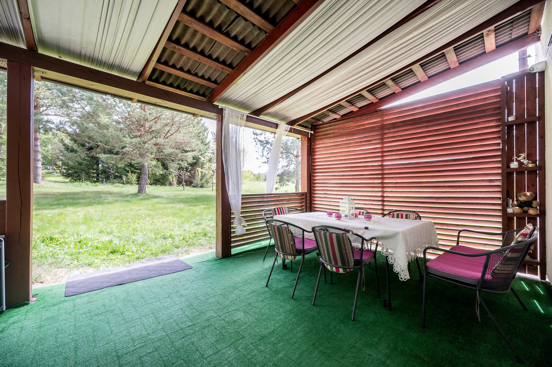 Iš svetainės patenkama tiesiai į terasą su uždengtu stogu– tai puiki vieta rytinei kavai, šeimos vakarienėms ar poilsiui gamtos apsuptyje.
